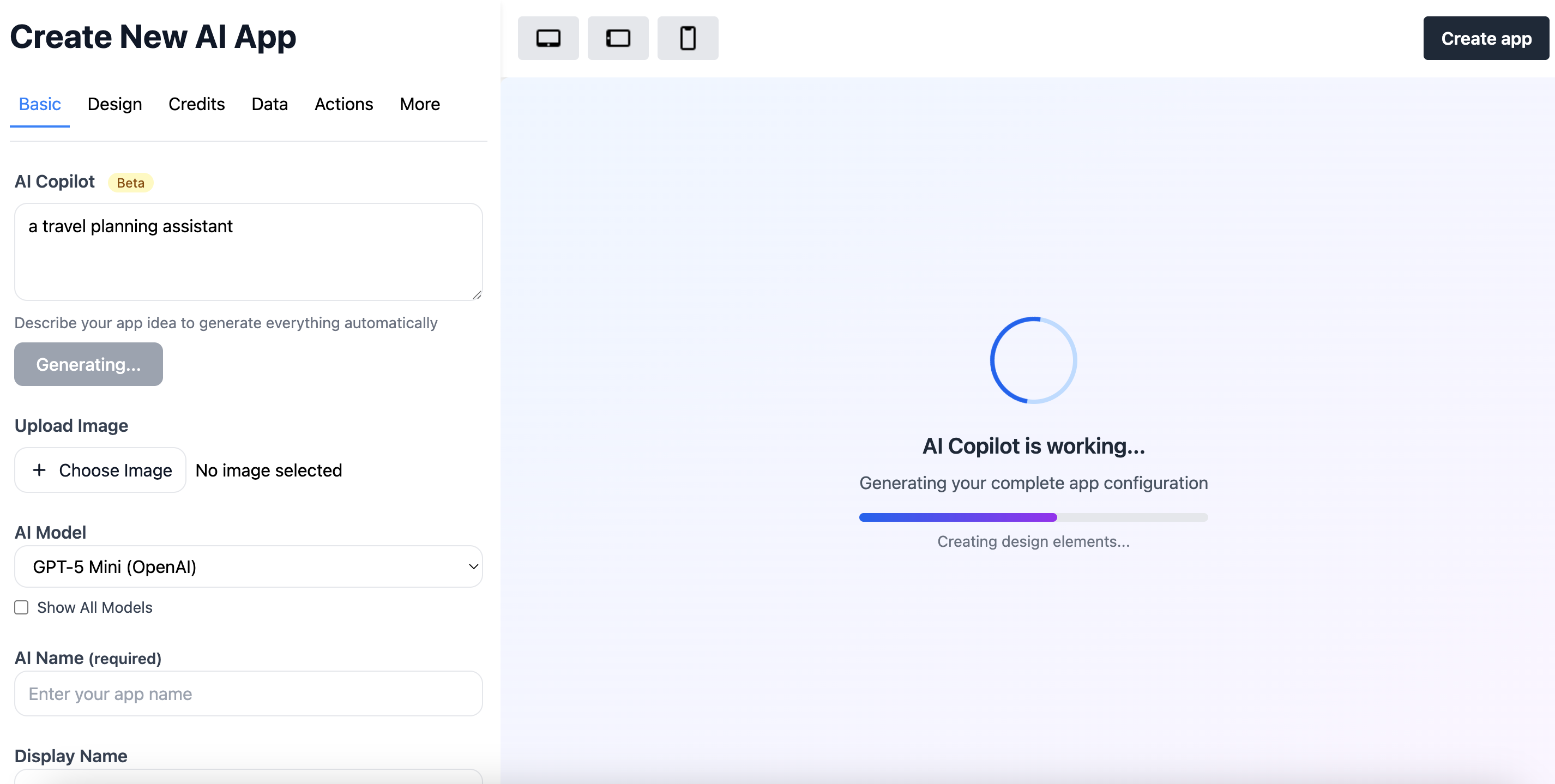 Accessible from the Dashboard β Create App β AI Copilot section.