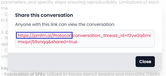 When the user shares a conversation, the link is created with “pmfm.ai/appName” URL, as shown below. Is it possible to create the sharing link with the custom URL used for this app? It is important to align with usage policies (particularly for academic uses).
